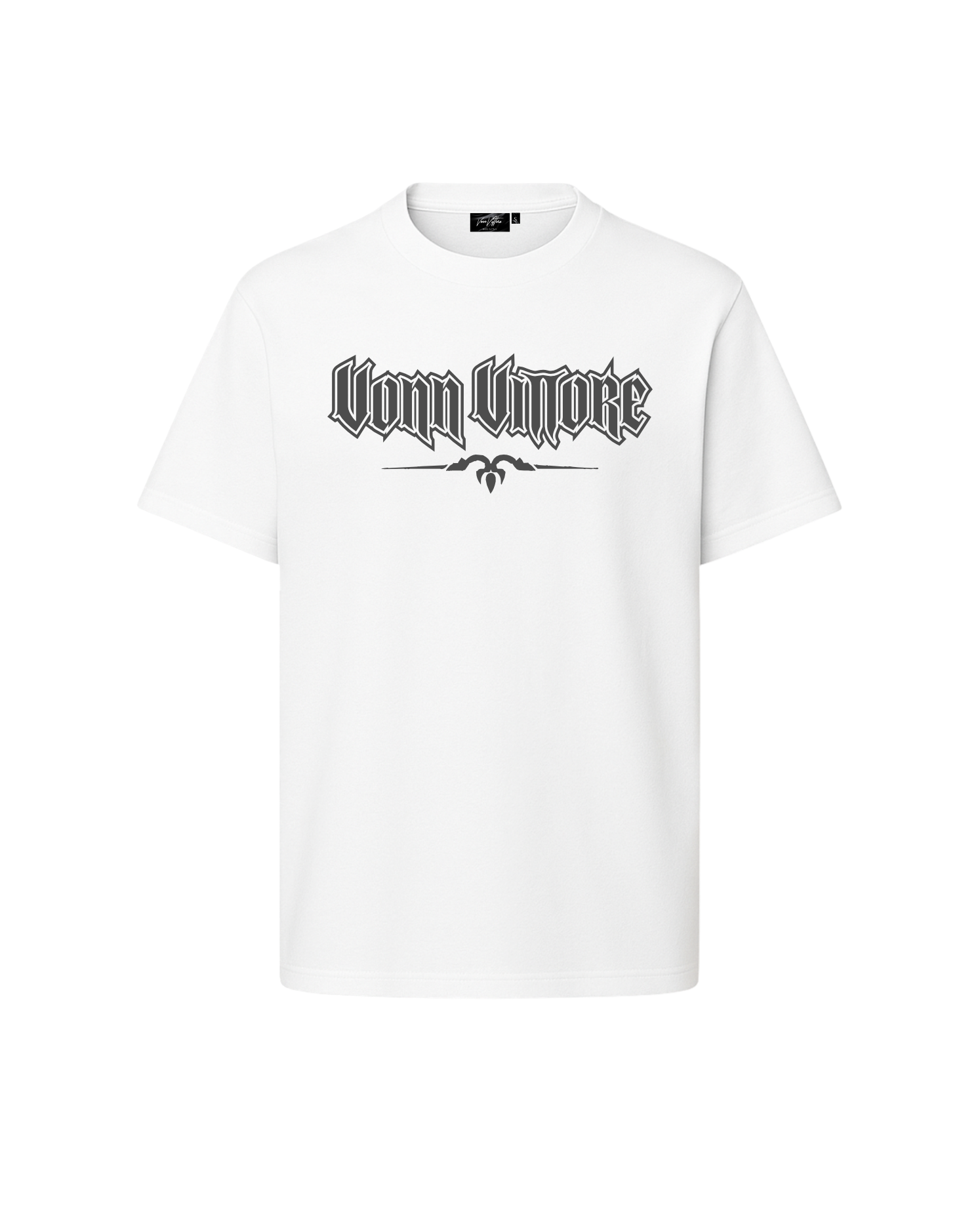 The Vonn Vittore “Vittoro” Reflective Tee delivers understated luxury with a bold presence. Crafted on a crisp white base, this tee features the signature Vittoro gothic wordmark across the chest, finished in a reflective silver print that subtly catches light and commands attention.